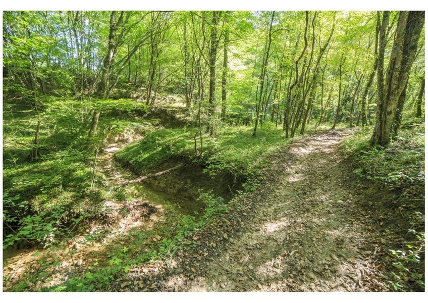 2. A un grand chêne, empruntez le chemin de terre, tournez à gauche, vous longez un beau mur en galets. Arrivé à la route, prenez à gauche vers le hameau de Fontaurie puis au bout de quelques mètres, prendre à nouveau à gauche. A hauteur du hameau, tournez à droite à la croix et à la 1ère fourche tournez à gauche pour garder le sentier qui s’enfonce dans un joli bois où chênes, frênes, charmes sont les principales essences d’arbres qui le constituent.