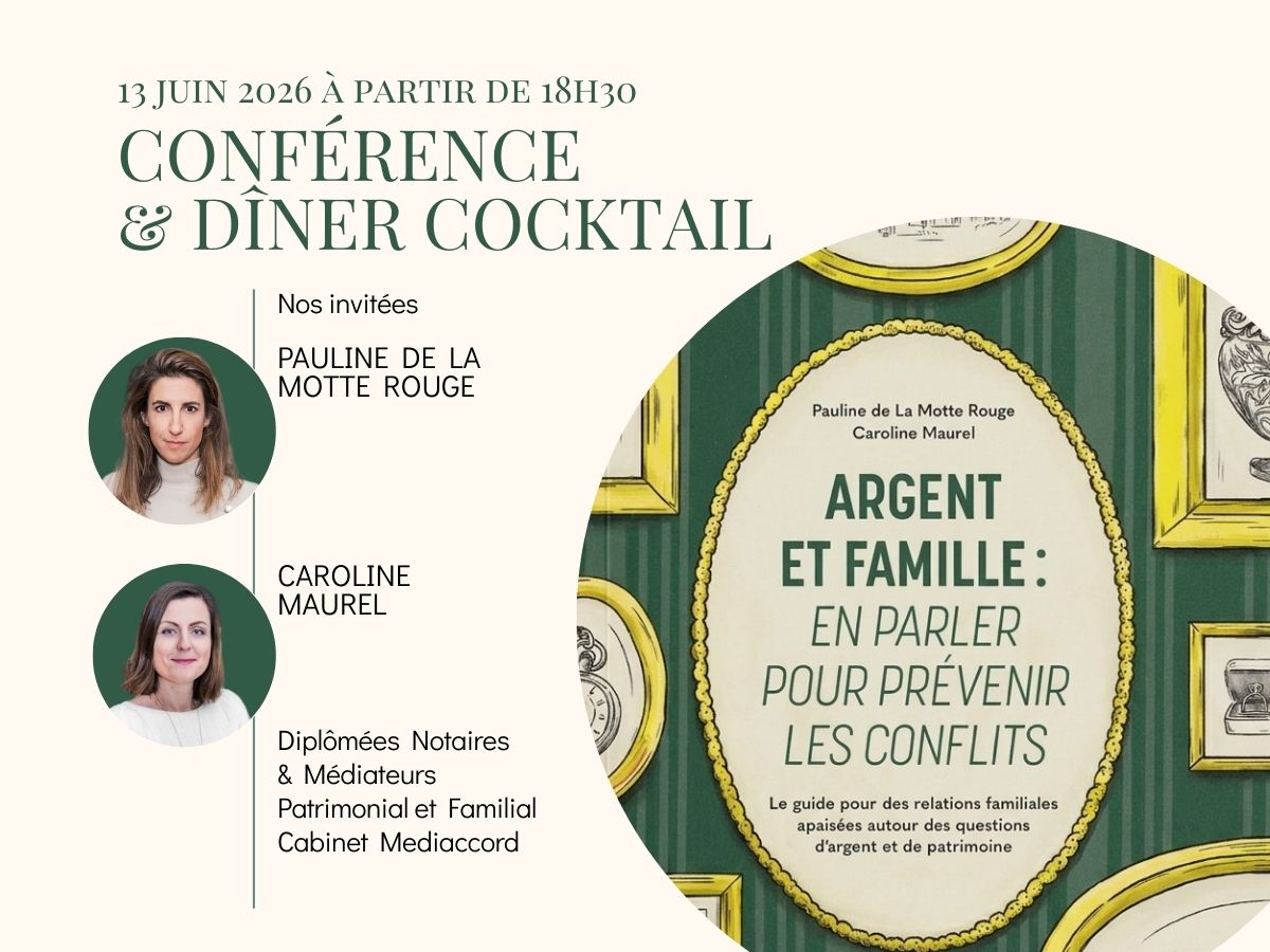 À l’occasion de la parution de leur livre « Argent et famille – En parler pour prévenir les conflits », nous aurons le plaisir d’accueillir Pauline de La Motte Rouge et Caroline Maurel, diplômées notaires et médiateurs patrimonial et familial au sein du cabinet Mediaccord.