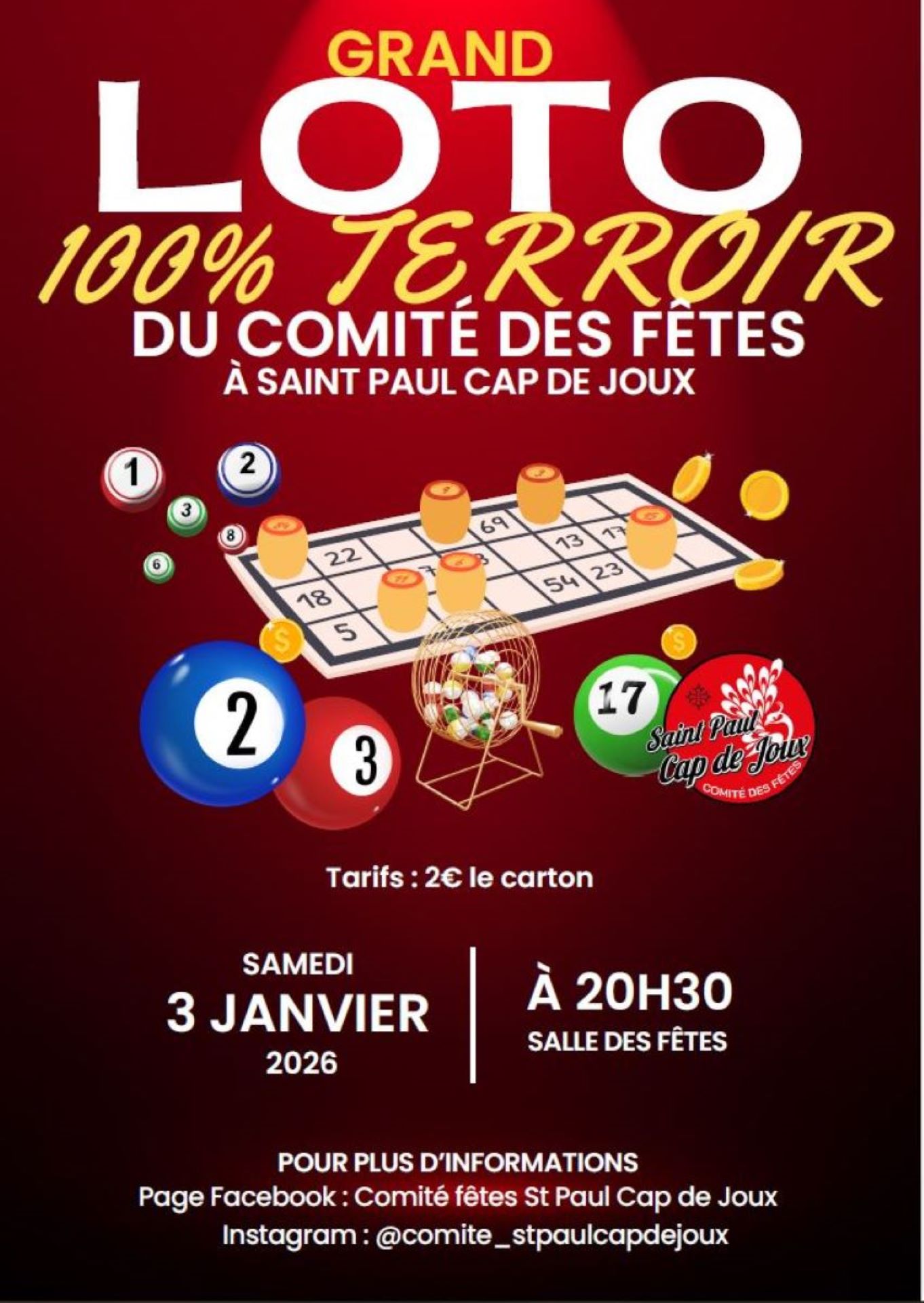 Le samedi 3 janvier 2026, à partir de 20h30, les membres du comité des fêtes de Saint-Paul-Cap-de-Joux vous accueillent pour le grand loto 100% terroir à la salle des fêtes du village !