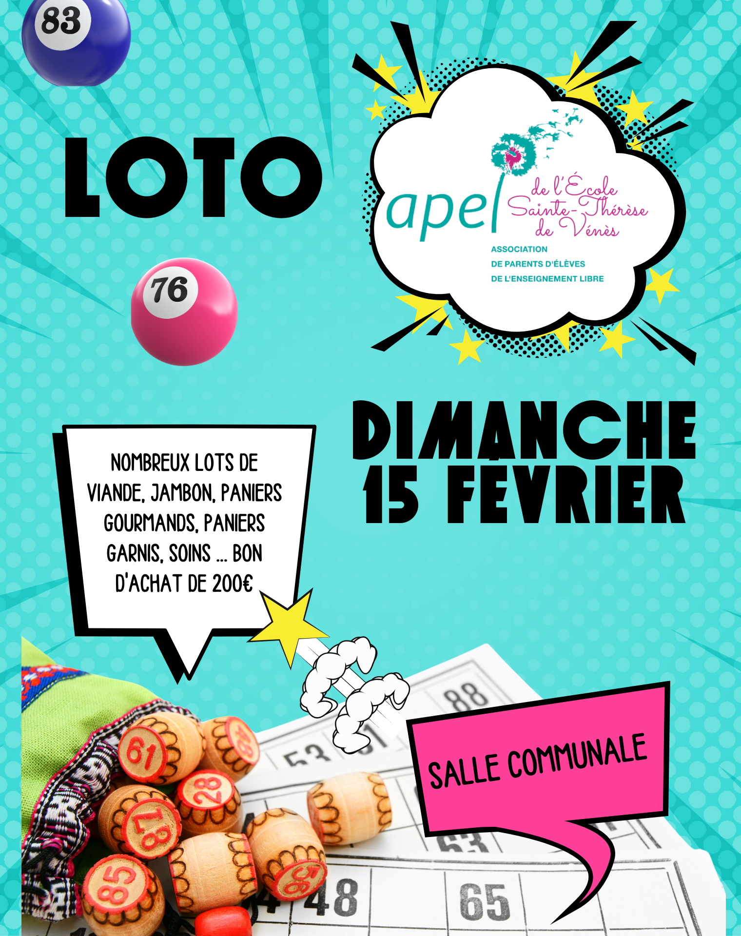 Le loto annuel de l'école Sainte-Thérèse de Vénès à lieu tous les ans, le dimanche avant le début des vacances. Il permet à l'Association de Parents d'élèves de récolter des fonds pour aider l'école à réaliser des projets, acheter du matériel pédagogique, faire des sorties culturelles, des voyages scolaires, ...