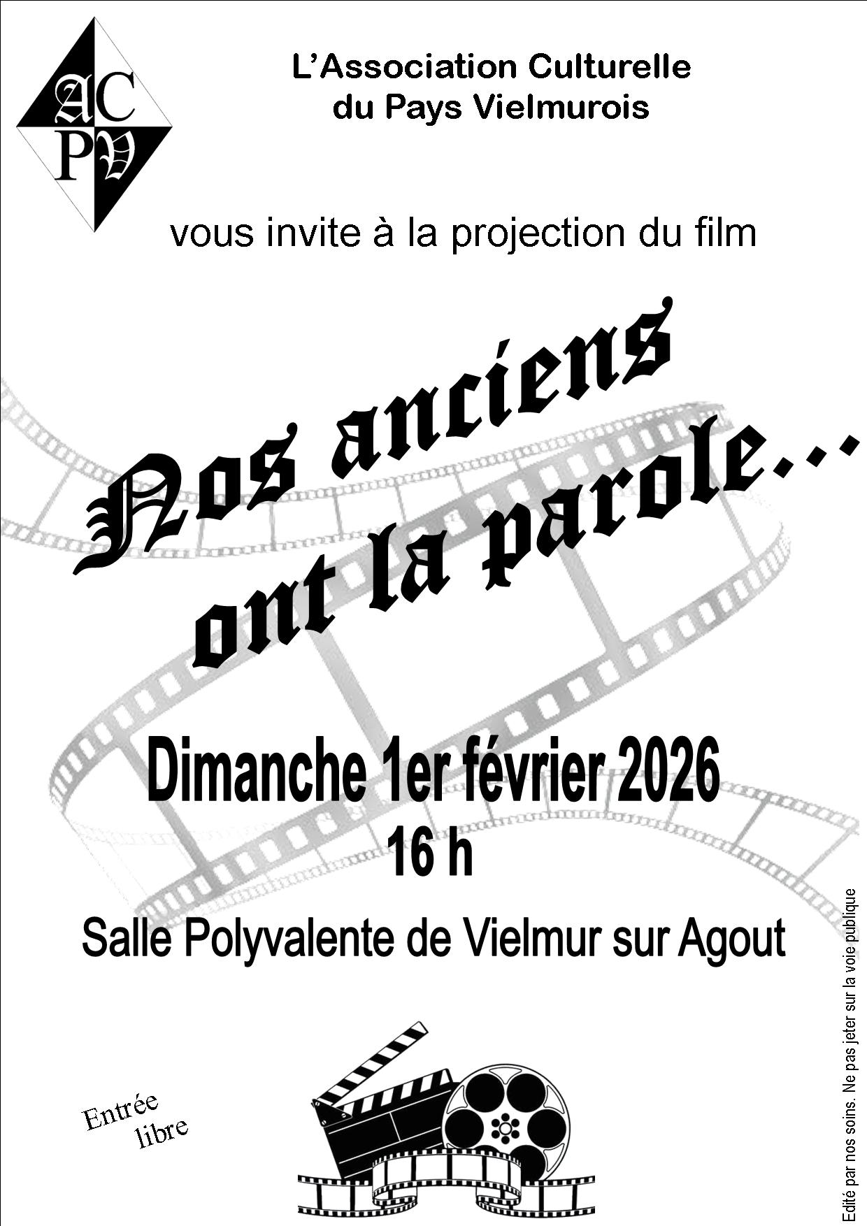 A l’occasion des 30 ans de sa création, l’Association Culturelle du Pays Vielmurois a initié le projet de recueil de la parole d’anciens vielmurois afin de conserver la mémoire de la vie d’antan. Un film a vu le jour à cette occasion, et a pu ainsi être diffusé. Cependant, vu l’intérêt porté par les habitants autour de ce document, et la demande insistante de tous ceux qui n’ont pas encore pu le voir, l’Association Culturelle du Pays Vielmurois a décidé de d’organiser une nouvelle diffusion de ce film (gratuitement) dans une grande salle.