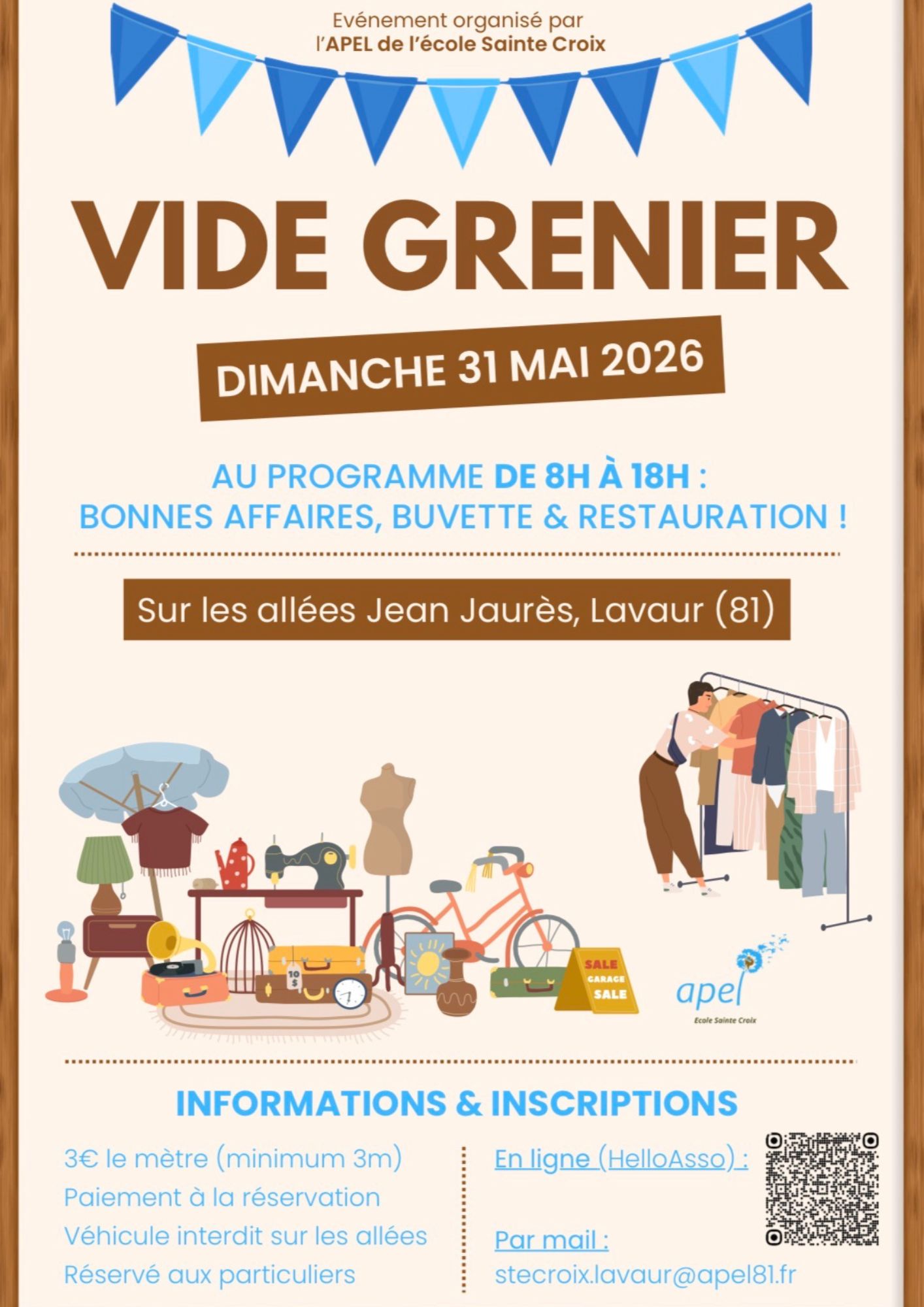 Vide grenier organisé par l’École Sainte Croix à Lavaur le dimanche 31 mai 2026 (Allées Jean Jaurès). De 8h à 18h : bonnes affaires, buvette et restauration. Exposants particuliers uniquement. Inscriptions ouvertes.