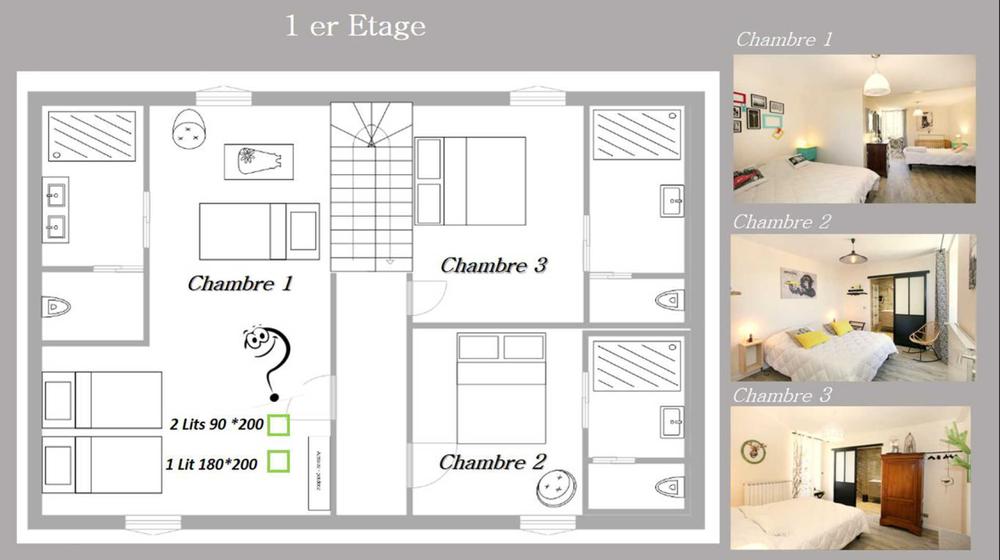 - 3 chambres, dont deux avec lit en 160cm et la dernière avec 3 lits simples en 90cm jumelables et lit bébé
