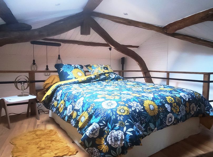 Le gîte comprend une cuisine équipée avec lave vaisselle, une chambre en mezzanine équipée d'un lit 160x200, un salon disposant d'un canapé lit grand confort.