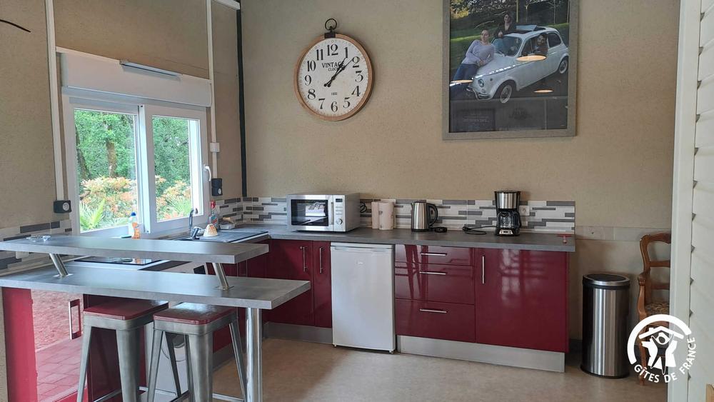 Une fois dans le hangar, vous profitez d'une seconde cuisine, plus grande, offrant plus d'équipements : plaque à induction, micro-ondes, cafetière à filtre, bouilloire, grille-pain, frigo top et machine à laver le linge. Sur le côté de la cuisine : grand congélateur ou mini-four électrique.