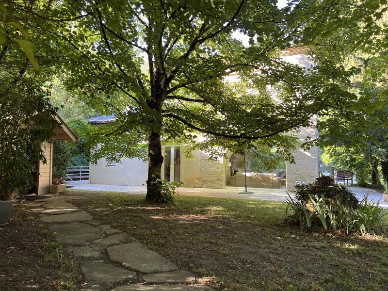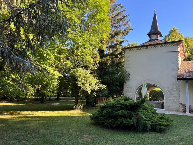 Grand parc arboré, terrasses tout autour du pigeonnier, boulodrome éclairé pour le soir, salon de jardin, barbecue. La piscine est sécurisée par une bâche à barres et traitée avec un produit non agressif : hypochlorite de calcium.