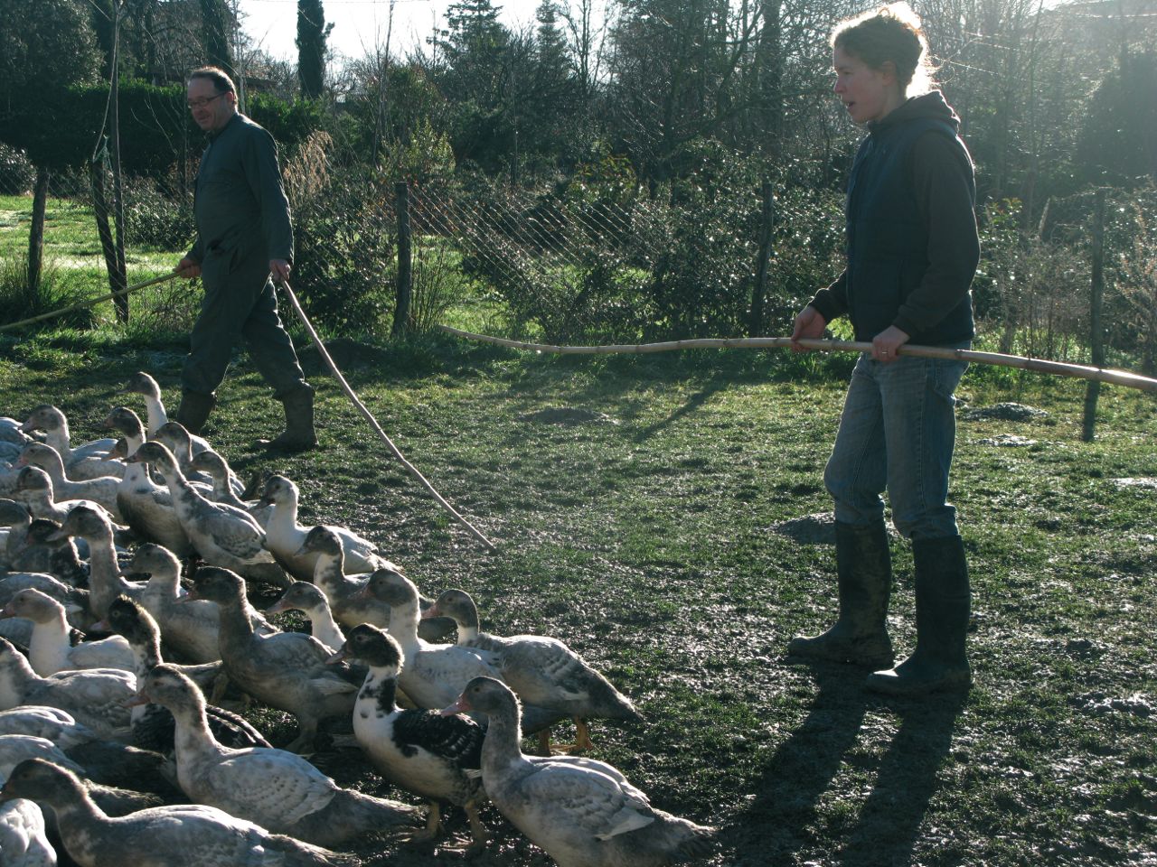 Viola et Mika élèvent des canards de Barbarie. À la différence du Mulard, l’autre canard gras, le canard de Barbarie ne supporte pas le gavage industriel. Il est très délicat, son élevage impose des soins particuliers et constants. Ces contraintes apparentes se marient bien avec la conception des deux éleveurs, d’une agriculture simple, à taille humaine et dans le respect des animaux.
