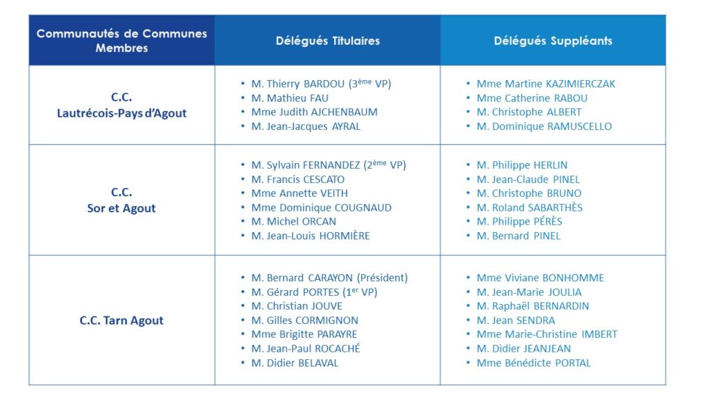 C’est l’organe délibérant : Il vote le budget, définit et approuve les programmes d’actions annuels. Il est composé de 18 délégués titulaires et 18 suppléants désignés par les 3 Communautés de communes.